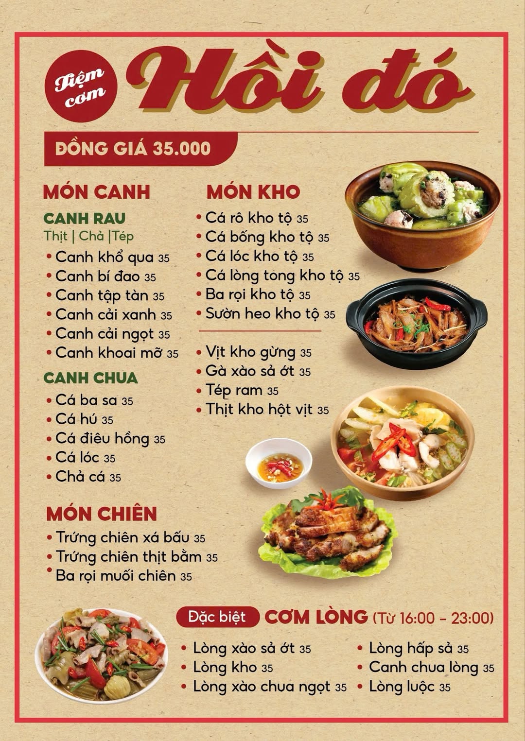 Đặc biệt, quán còn có cơm lòng buổi tối – một “đặc sản” riêng với các món như lòng xào sả ớt, lòng kho, canh chua lòng… rất đáng thử.