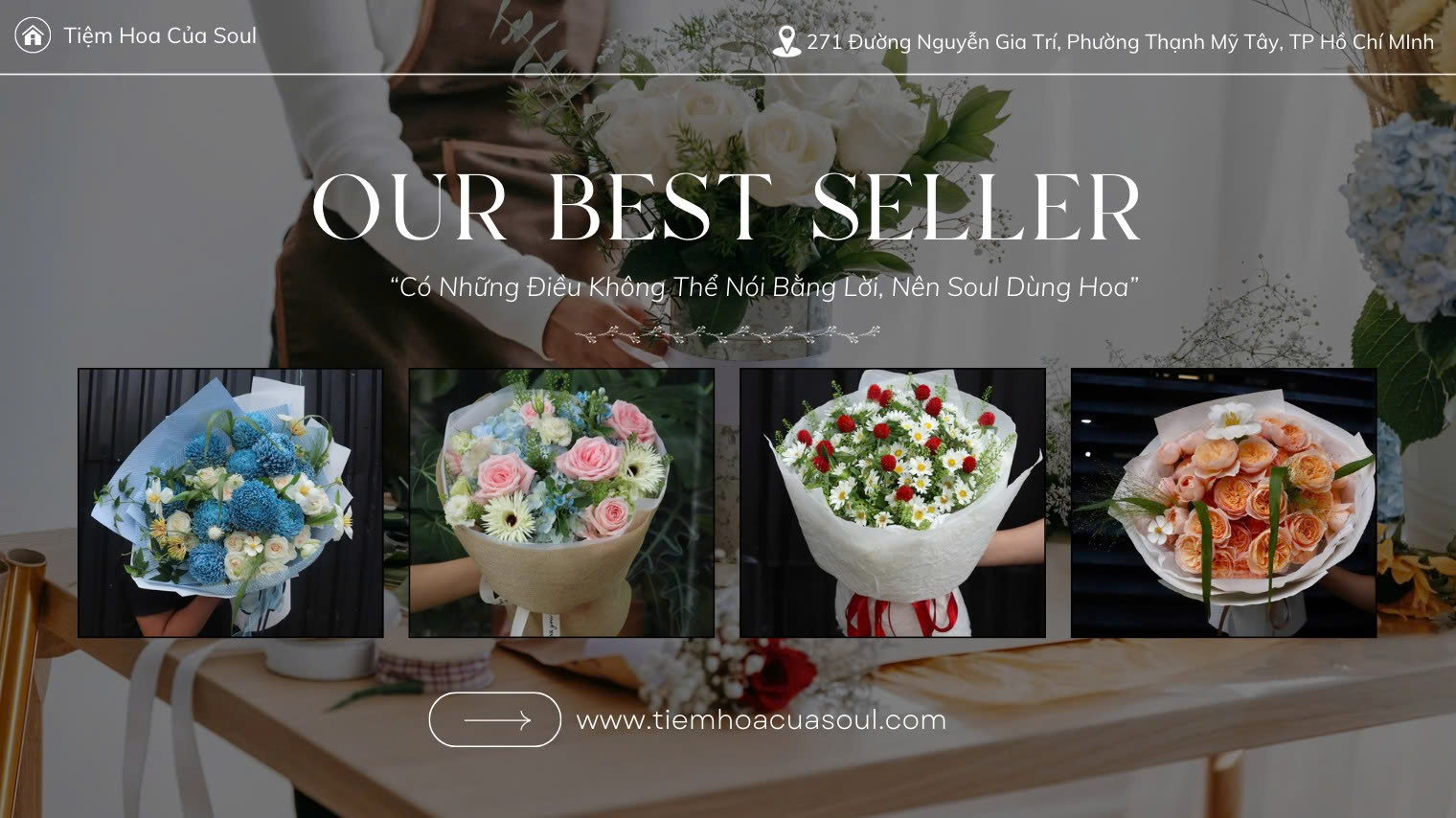 Nhắc đến tiệm hoa tươi uy tín ở Bình Thạnh, không thể bỏ qua Tiệm Hoa Của Soul. Ngay từ cái tên, “Soul” – nghĩa là linh hồn – đã thể hiện triết lý sâu sắc: Mỗi bó hoa được tạo nên để chạm đến trái tim người nhận.