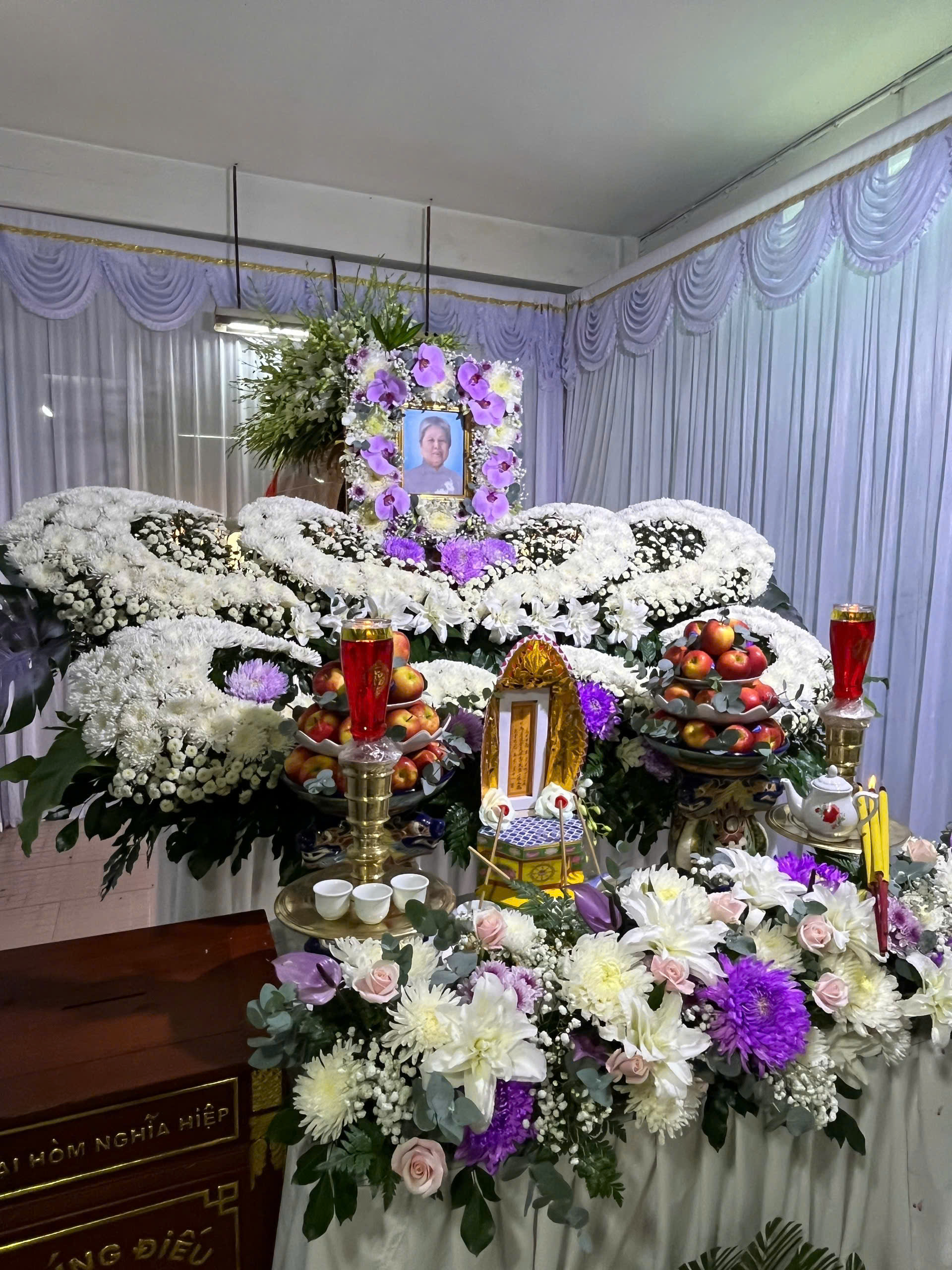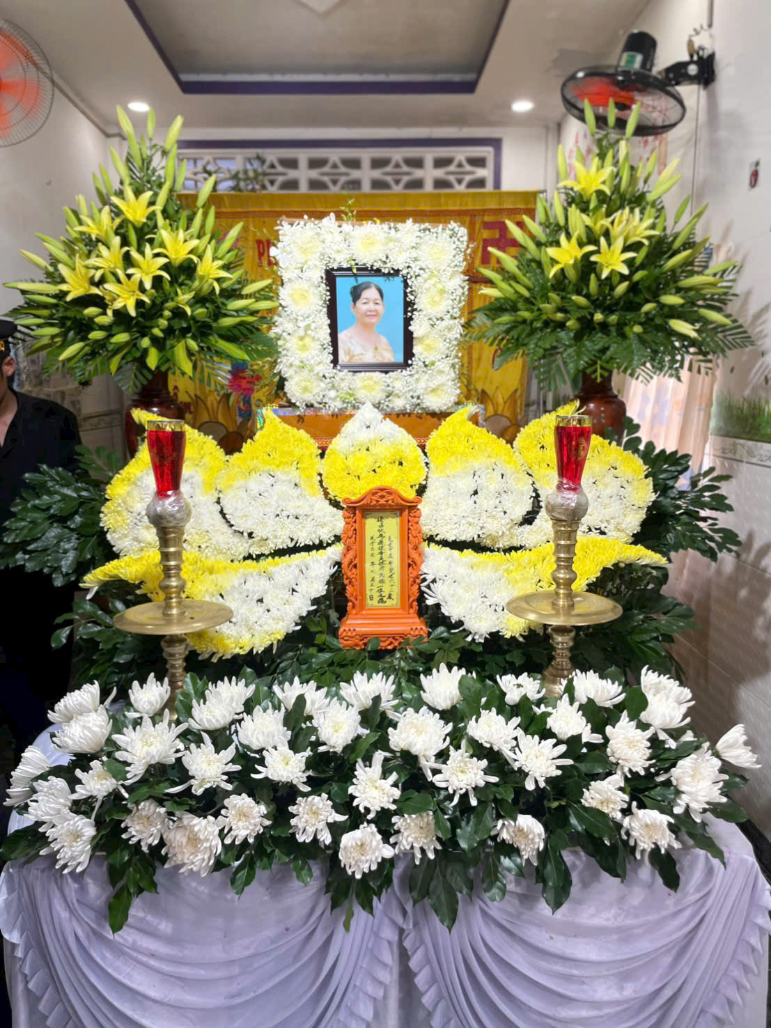 Lễ viếng được trang trí hoa tươi, phông nền trang trọng.