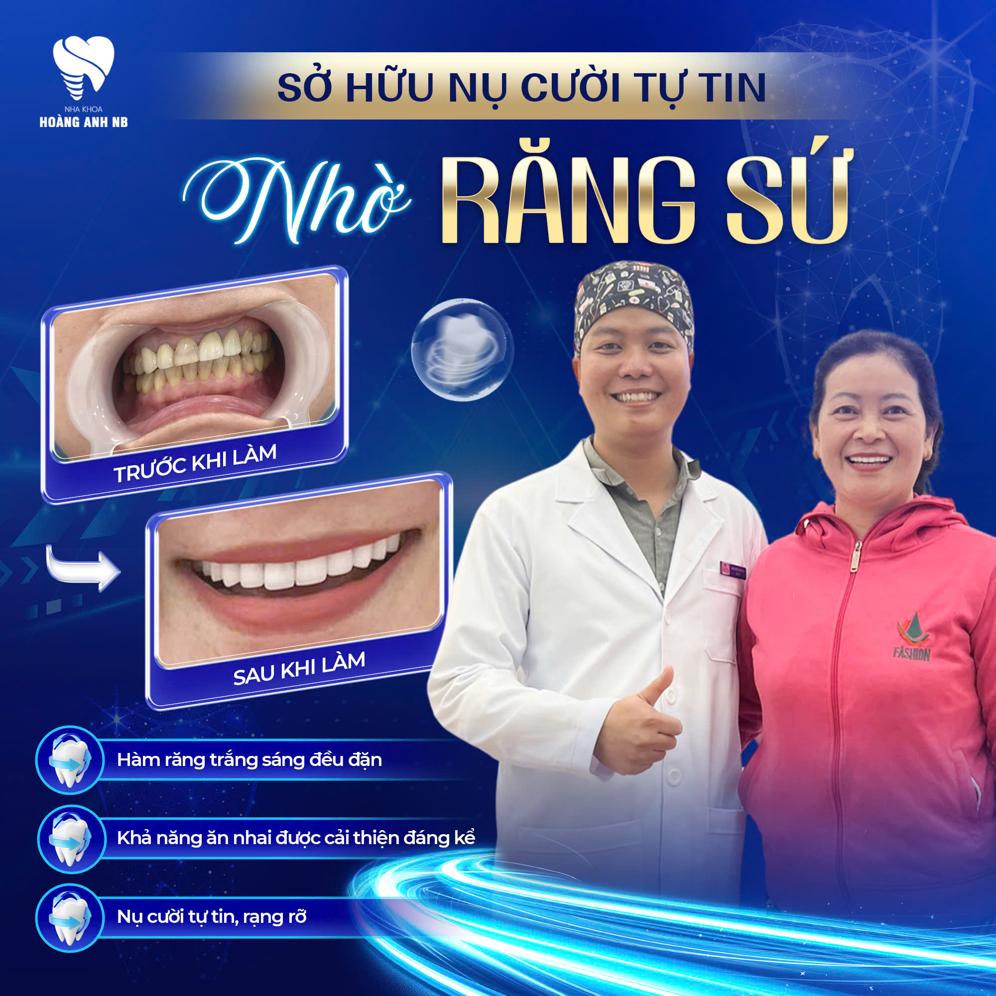 Nha Khoa HOÀNG ANH NB nổi bật với phương châm "Tận tâm – Chuyên nghiệp – Hiệu quả". Phòng khám chú trọng vào việc mang lại trải nghiệm điều trị không đau và kết quả thẩm mỹ tối ưu nhất.