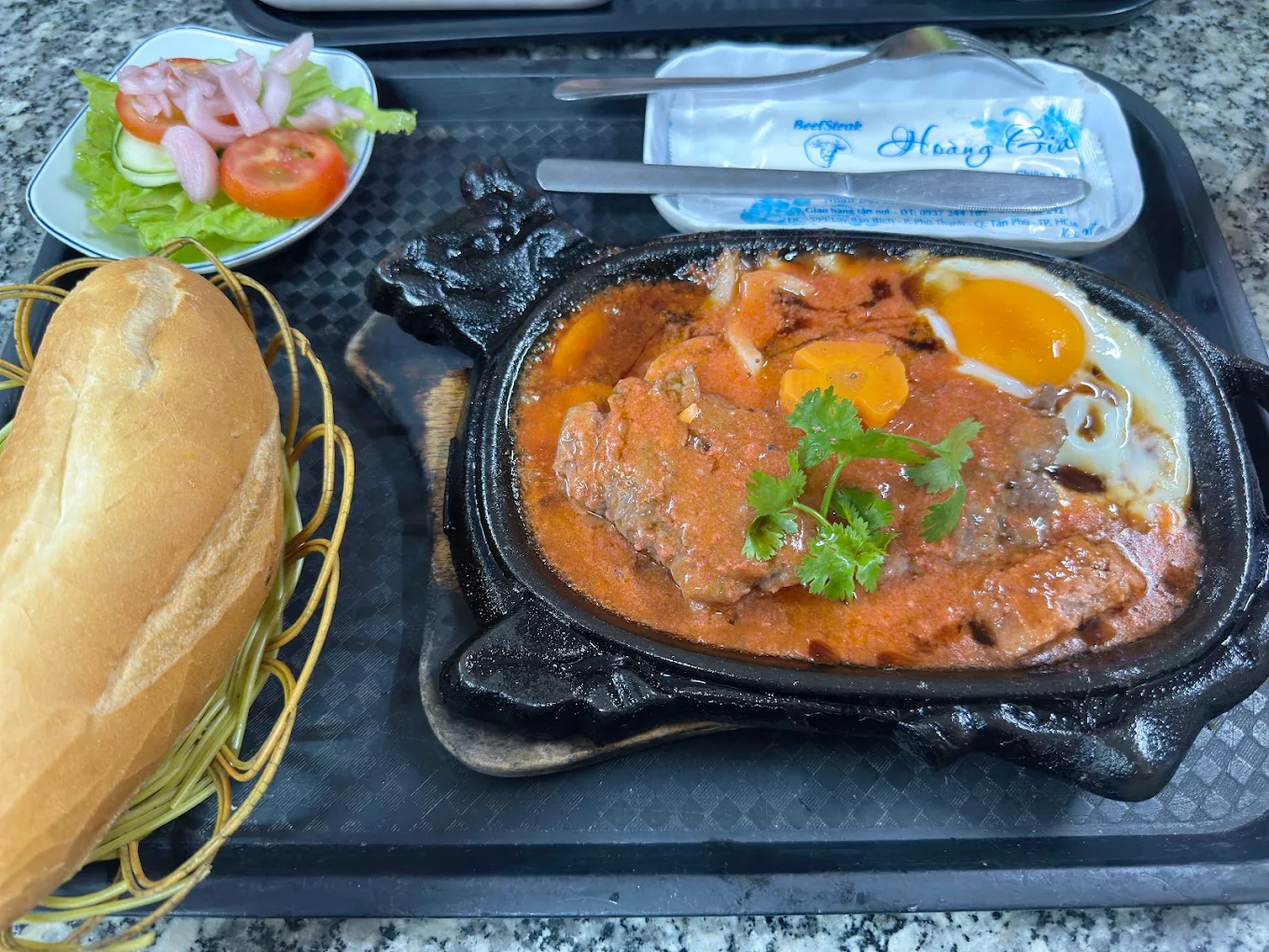 Beefsteak tại đây được phục vụ nóng hổi, kết hợp cùng: