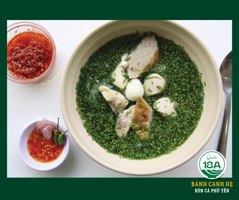 Hương vị chuẩn Phú Yên: Quán quảng bá là “Bánh Canh Hẹ – Bún Cá – Cơm Gà Phú Yên 18A, chính gốc Tuy Hòa”.
