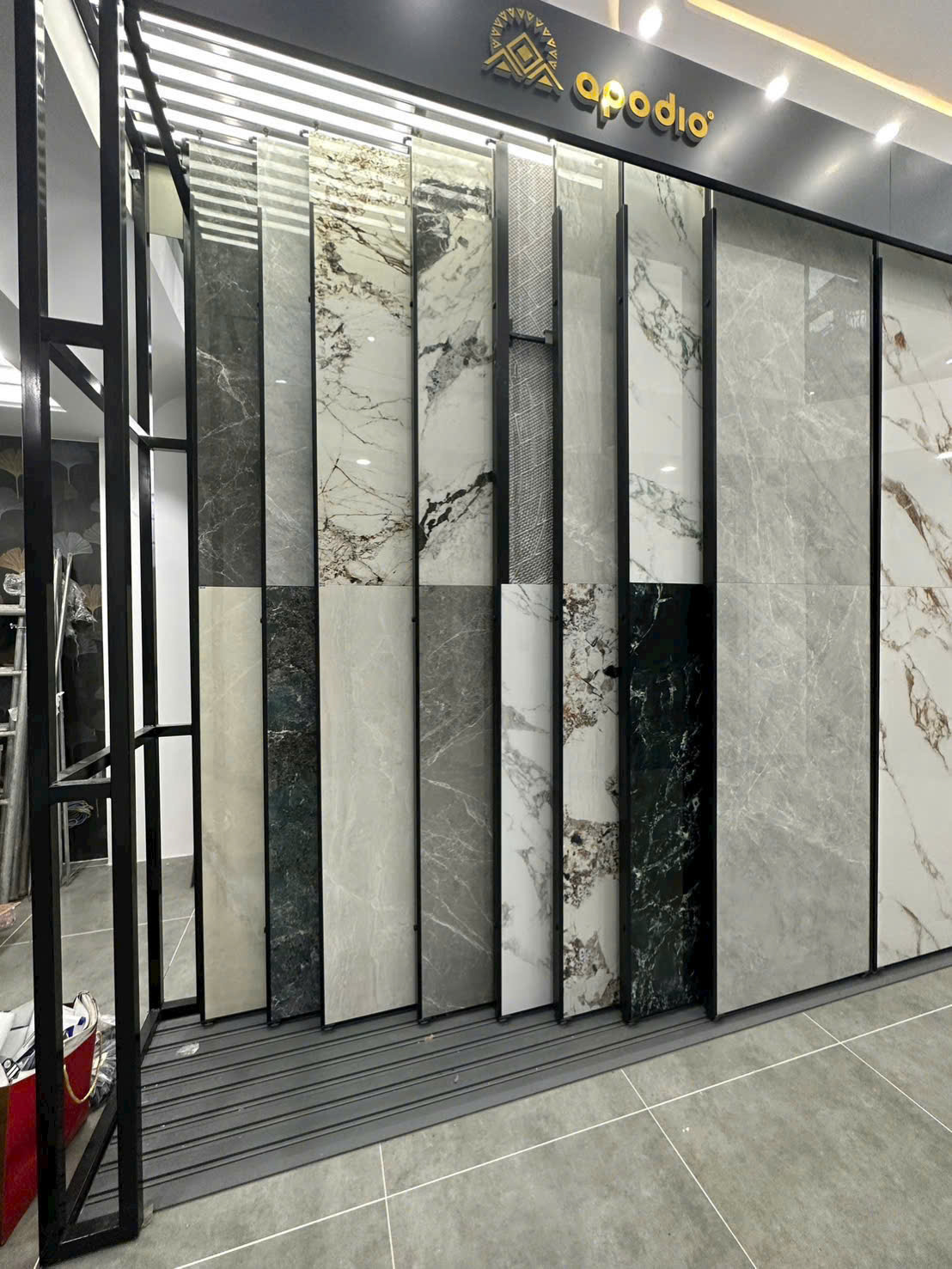 Các hình ảnh tại showroom Hoàng Ân nổi bật với những tấm gạch khổ lớn ấn tượng từ thương hiệu Apodio (còn được gọi là Sintered Stone hay Porcelain Slab). Đây là sản phẩm đột phá về công nghệ và thẩm mỹ, đang tạo nên cơn sốt trong giới kiến trúc sư và chủ đầu tư: