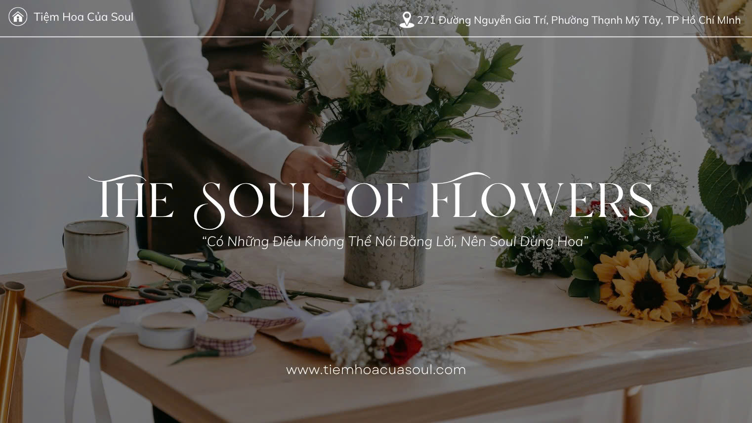 Nhắc đến tiệm hoa tươi uy tín ở Bình Thạnh, không thể bỏ qua Tiệm Hoa Của Soul. Ngay từ cái tên, “Soul” – nghĩa là linh hồn – đã thể hiện triết lý sâu sắc: Mỗi bó hoa được tạo nên để chạm đến trái tim người nhận.