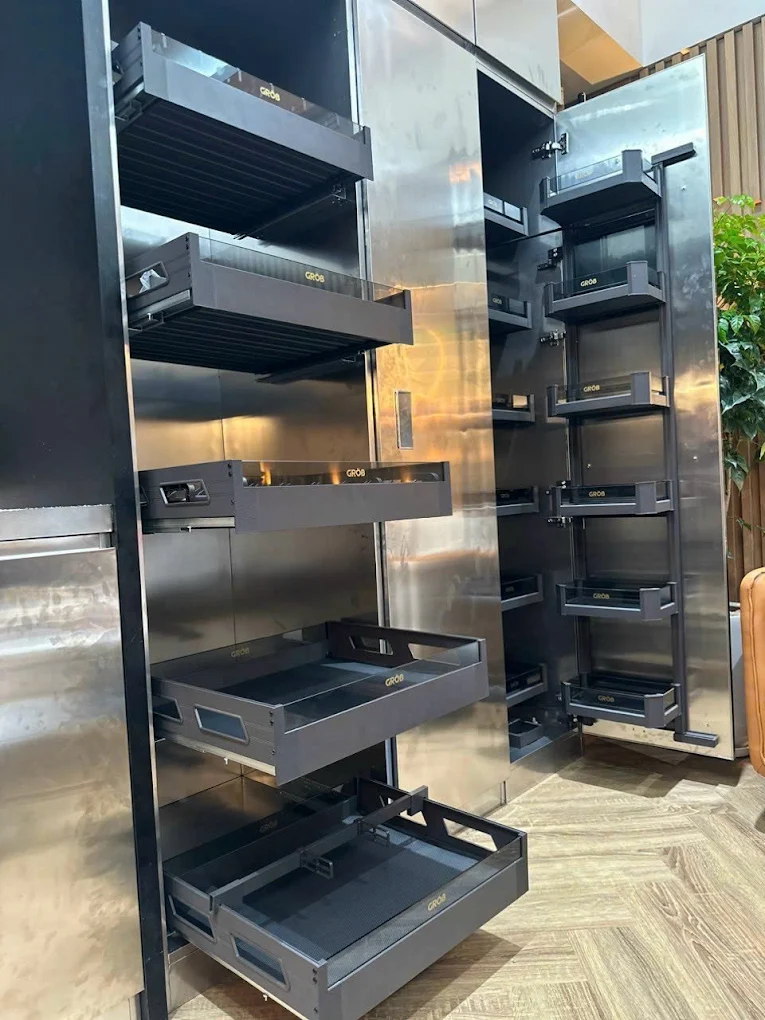 Phụ kiện tủ bếp thông minh: ray kéo, bản lề giảm chấn, kệ xoay góc, ngăn chia tiện lợi