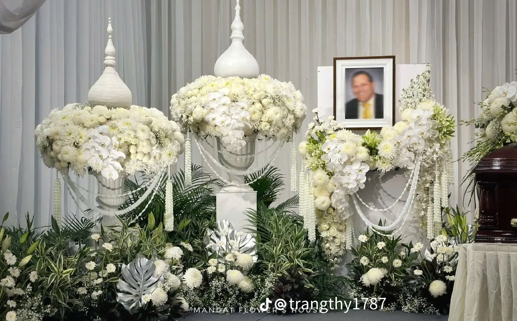 Lễ viếng được trang trí hoa tươi, phông nền trang trọng.