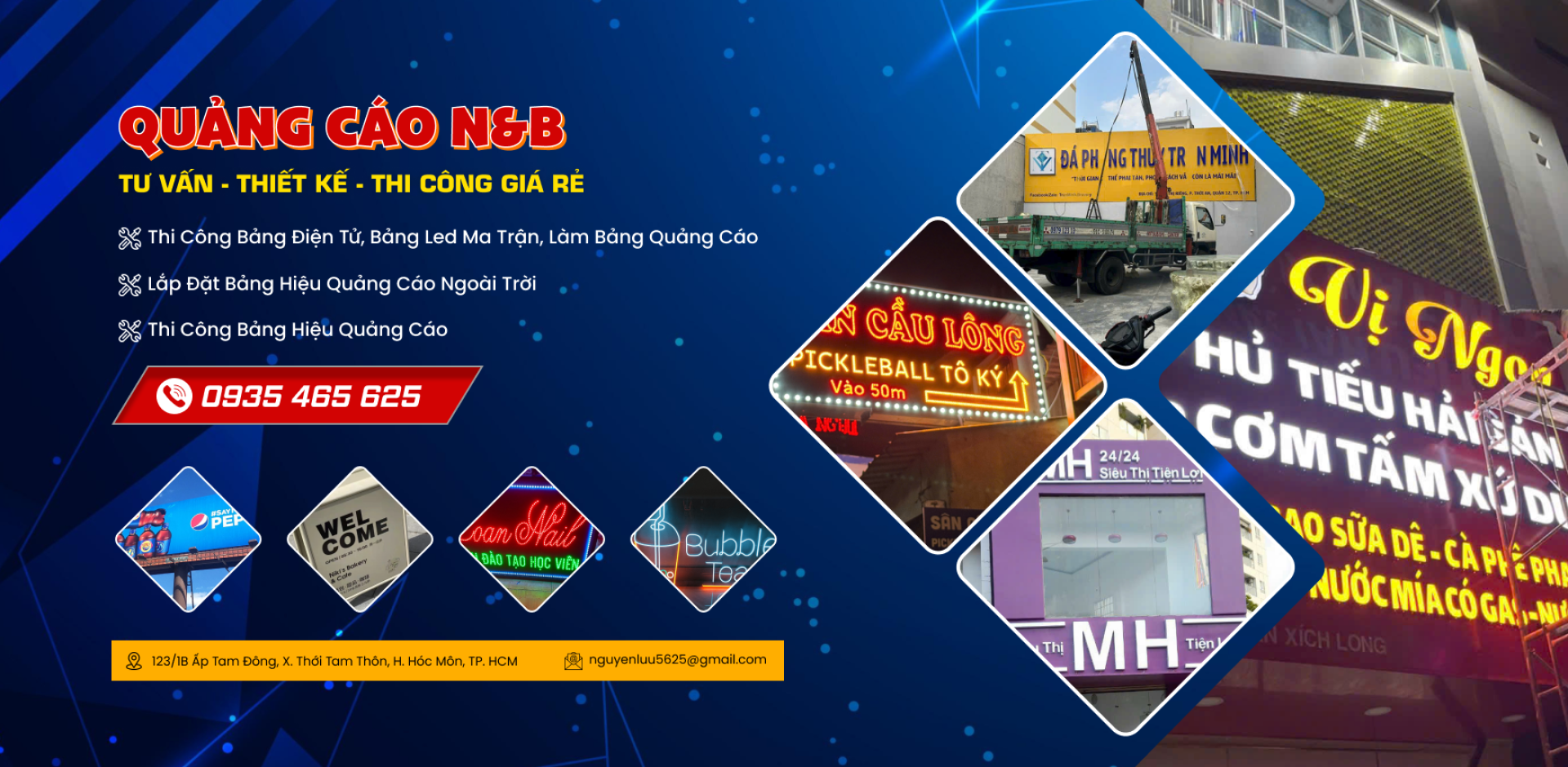 Khi nhắc đến các công ty làm biển quảng cáo chuyên nghiệp tại khu vực Hóc Môn, Quảng Cáo N&B luôn là cái tên được nhiều khách hàng ưu tiên lựa chọn. Với nhiều năm kinh nghiệm hoạt động trong lĩnh vực thiết kế – thi công bảng hiệu, hộp đèn, chữ nổi mica, alu, inox, LED quảng cáo ngoài trời, N&B đã và đang khẳng định vị thế của mình bằng chất lượng sản phẩm vượt trội và dịch vụ tận tâm.