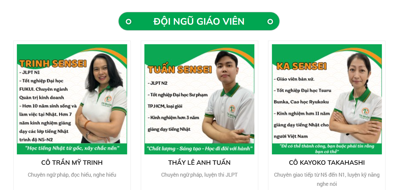 Trí Nhân sở hữu đội ngũ giảng viên có trình độ N2 trở lên, nhiều người đã từng du học hoặc làm việc tại Nhật Bản, đem lại trải nghiệm học tập thực tế và chuyên sâu.
