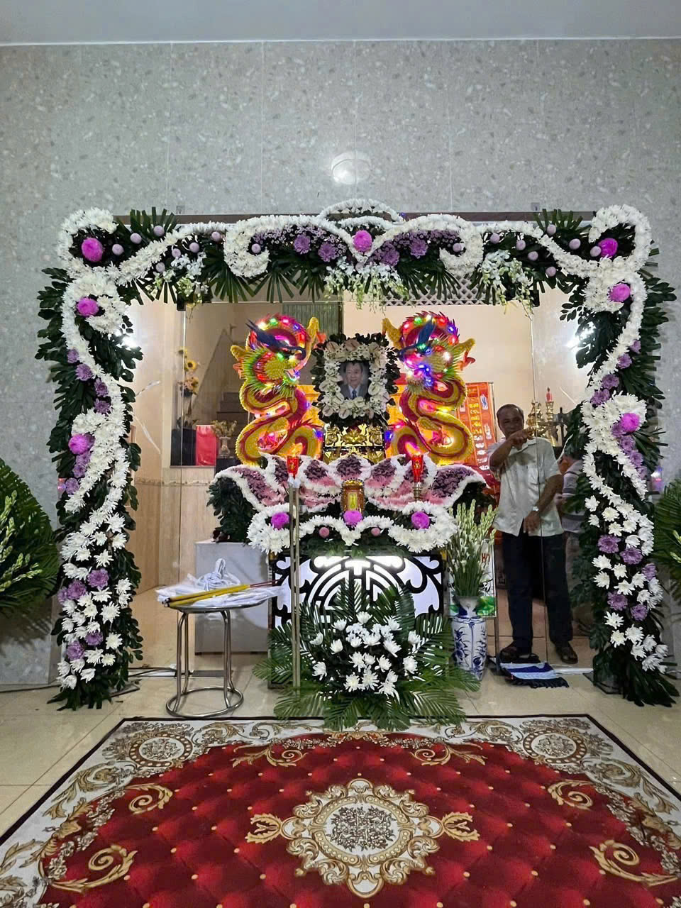 Trang trí không gian tang lễ bằng hoa sen, đèn nến, nhạc thiền nhẹ.