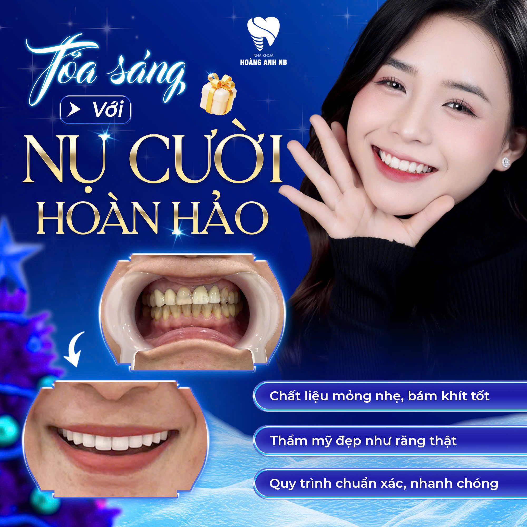 Nha Khoa HOÀNG ANH NB nổi bật với phương châm "Tận tâm – Chuyên nghiệp – Hiệu quả". Phòng khám chú trọng vào việc mang lại trải nghiệm điều trị không đau và kết quả thẩm mỹ tối ưu nhất.