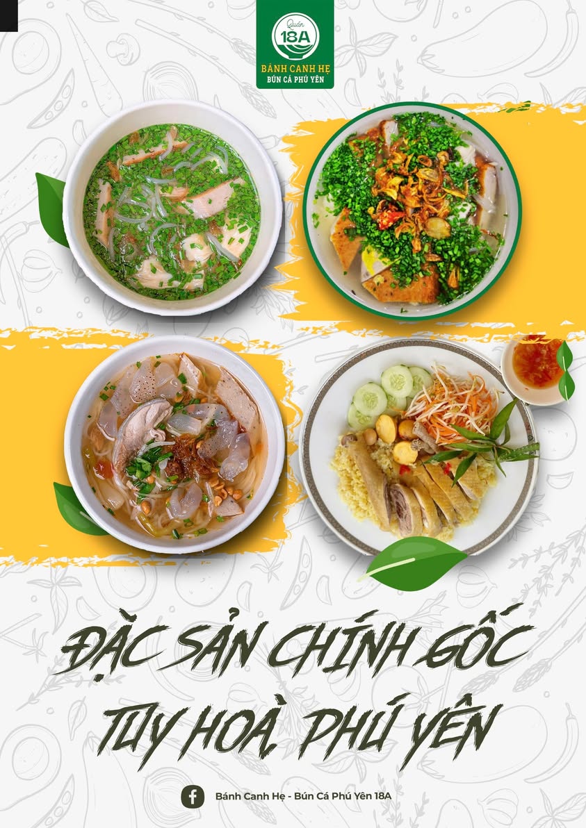 Hương vị chuẩn Phú Yên: Quán quảng bá là “Bánh Canh Hẹ – Bún Cá – Cơm Gà Phú Yên 18A, chính gốc Tuy Hòa”.