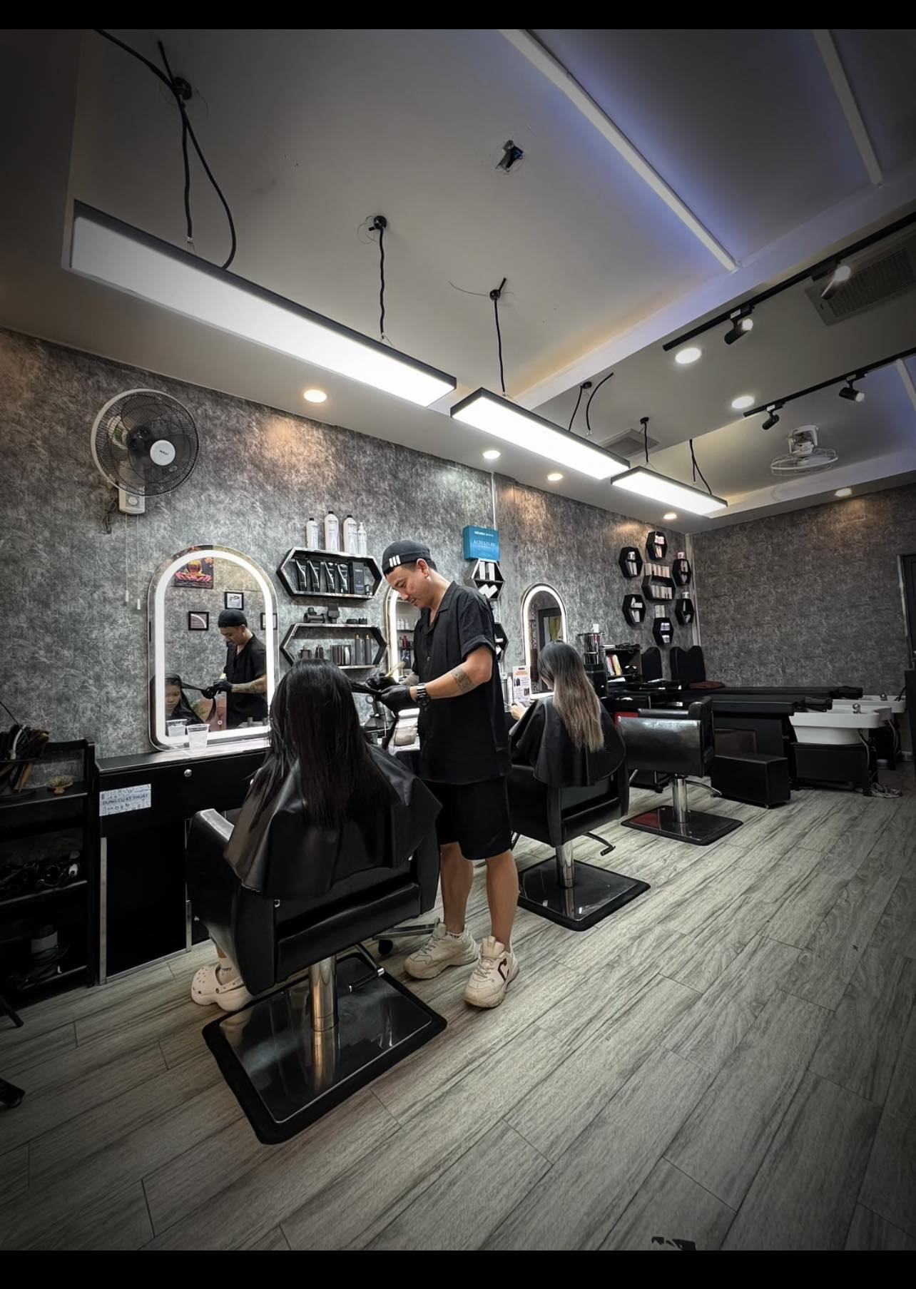 Không gian tiệm được thiết kế hiện đại, trẻ trung và sang trọng, mang hơi hướng Hàn Quốc. Tông màu tối – ánh sáng vàng nhẹ tạo cảm giác ấm cúng, thư giãn. Mỗi chi tiết trong tiệm – từ ghế cắt, gương soi, bàn lễ tân cho đến khu vực gội đầu – đều được bố trí tỉ mỉ, tạo nên trải nghiệm cao cấp ngay từ cái nhìn đầu tiên.
